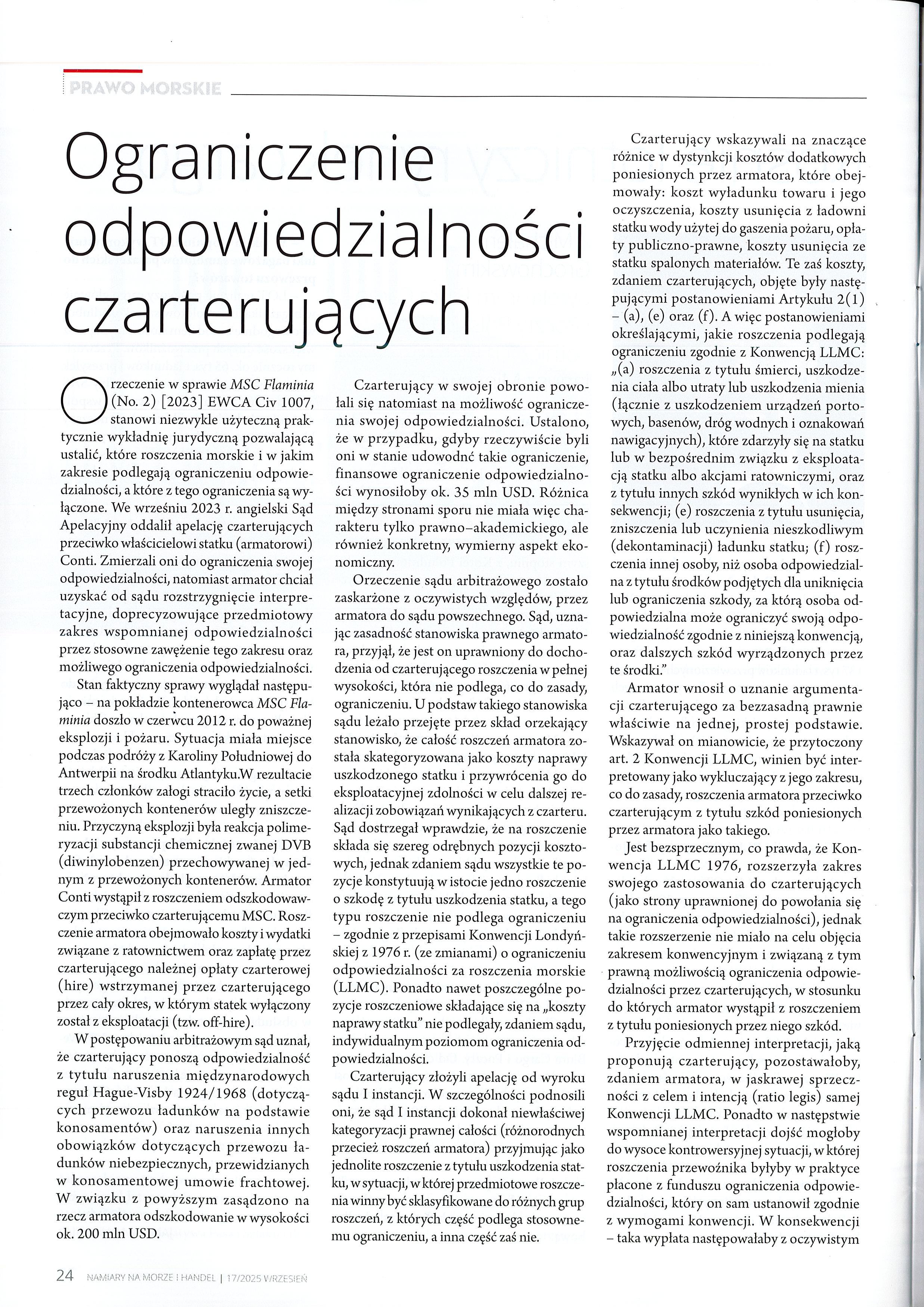 Dwutygodnik NAMIARY na morze i handel opublikował artykuł: "Ograniczenie odpowiedzialności czarterujących" Autor: Marek Czernis Zapraszamy do lektury.