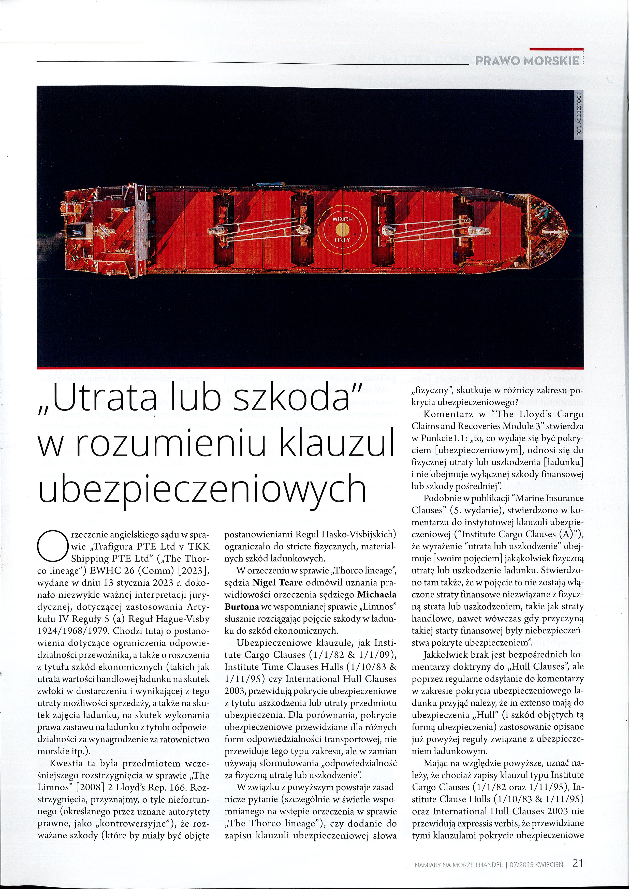 NAMIARY na morze i handel opublikował artykuł: "Utrata lub szkoda" w rozumieniu klauzul ubezpieczeniowych Autor: Marek Czernis Zapraszamy do lektury,