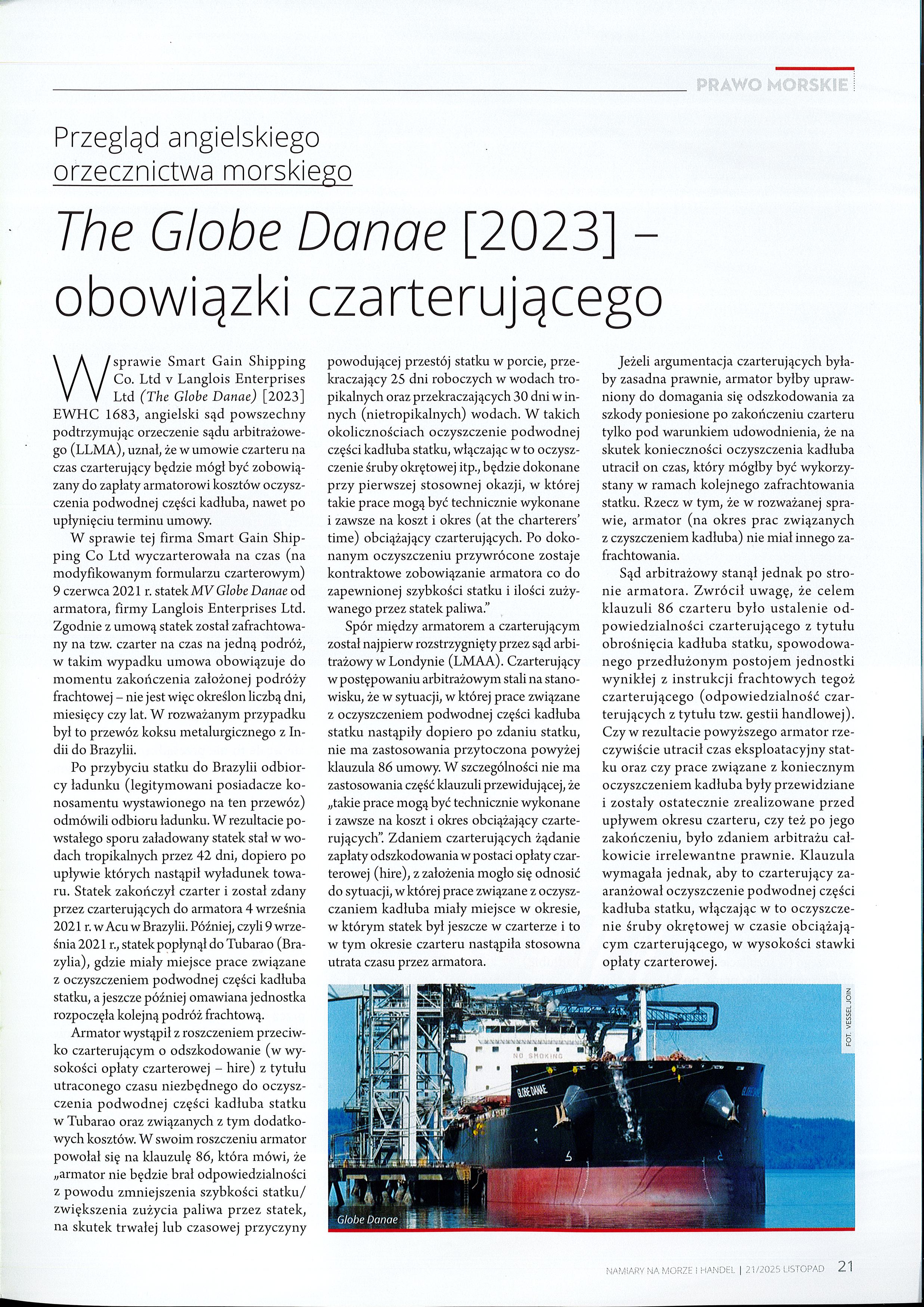 Dwutygodnik NAMIARY na morze i handel opublikował artykuł: The Globe Danae [2023] - obowiązki czarterującego. Autor: Marek Czernis Zapraszamy do lektury: